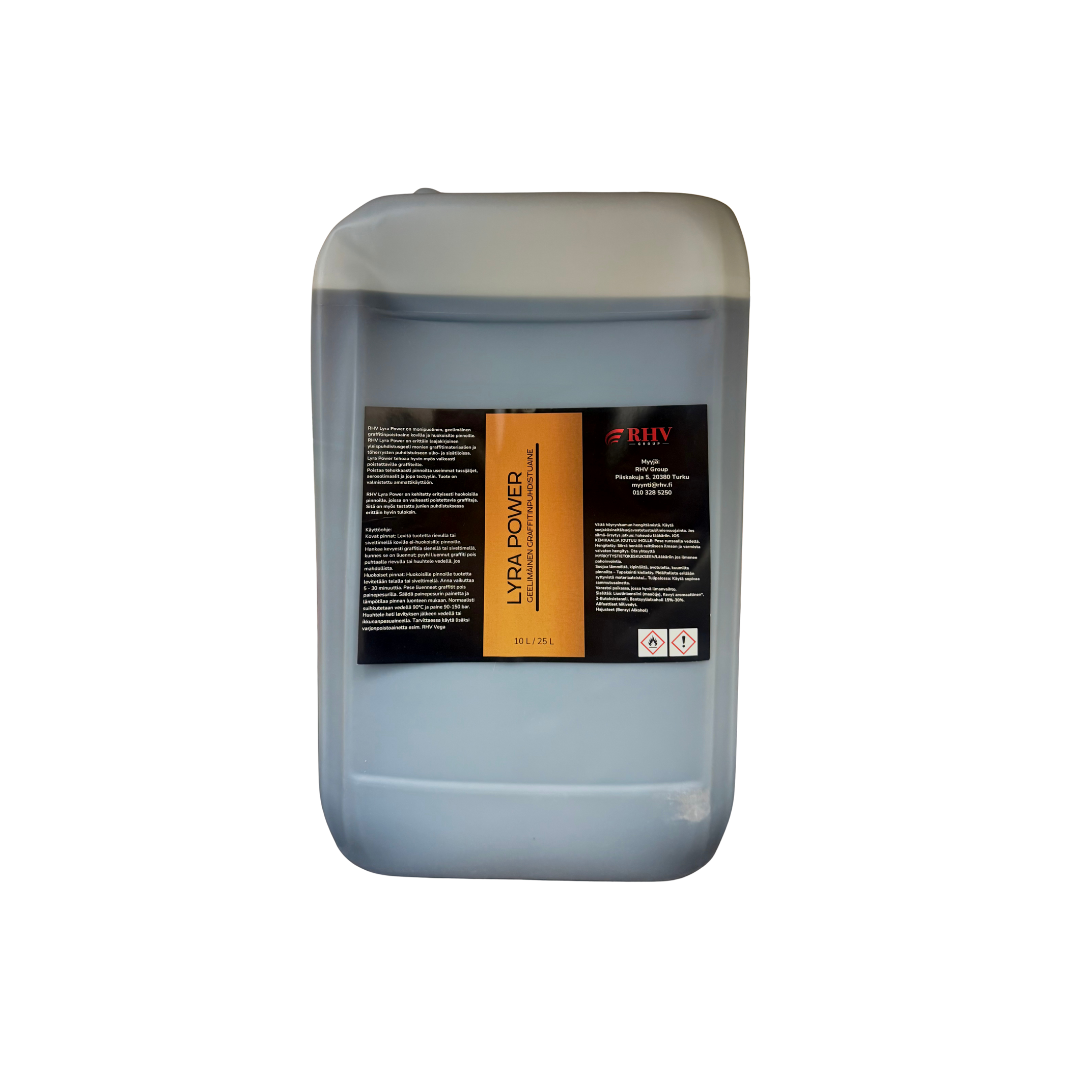 RHV Lyra Power on monipuolinen, geelimäinen graffitinpoistoaine koville ja huokoisille pinnoille. RHV Lyra Power on erittäin laajakirjoinen yleispuhdistusgeeli monien graffitimalien ja töherrysten puhdistukseen ulko- ja sisätiloissa. Lyra Power tehoaa erittäin hyvin todella vaikeasti poistettaville graffiteille. Poistaa tehokkaasti pinnoilta useimmat tussijäljet, aerosolimaalit ja jopa tectyylin. Tuote on valmistettu ammattikäyttöön.